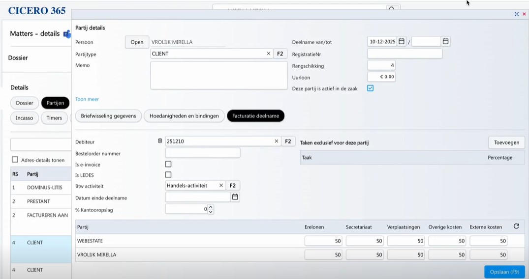 Bij Matter > Partijen > Client > Open je met het Potloodje > de Patij details > Daar klink je 'Facturatie deelname'