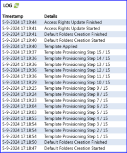 Daarbij wordt (zoals voor een nieuw dossier) een site aangemaakt en site template toegepast. Onder Log kunt u de stappen volgen (eventueel met de groene refresh pijltjes het scherm bijwerken), daarbij worden 15 stappen doorlopen en nadien worden de rechten nog bijgewerkt.